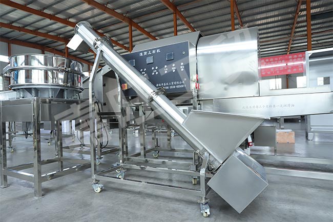 產(chǎn)品通過面粉床均勻輸送到三個滾筒里,產(chǎn)品和面粉一起掉落,在滾筒內(nèi)翻轉(zhuǎn)混合后,均勻落入輸送帶上輸出,適合自然帶骨和去骨產(chǎn)品,鹽酥雞類產(chǎn)品的預(yù)上粉和最終裹涂環(huán)節(jié),裹涂后面粉有鱗片感。