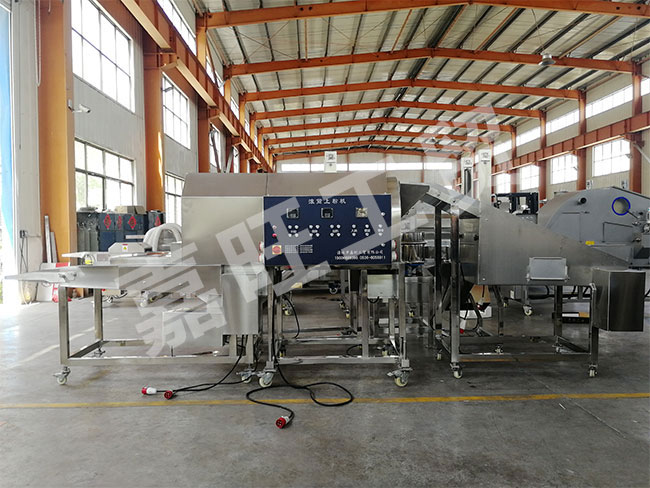 產(chǎn)品通過面粉床均勻輸送到三個滾筒里,產(chǎn)品和面粉一起掉落,在滾筒內(nèi)翻轉(zhuǎn)混合后,均勻落入輸送帶上輸出,適合自然帶骨和去骨產(chǎn)品,鹽酥雞類產(chǎn)品的預上粉和最終裹涂環(huán)節(jié),裹涂后面粉有鱗片感。
